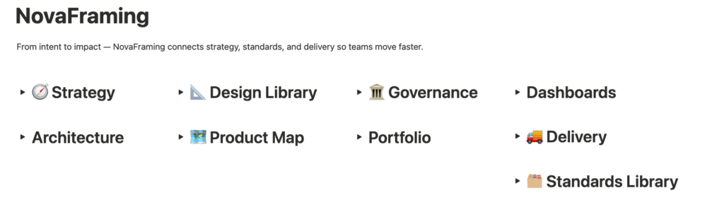 NovaFraming makes architecture actionable: patterns teams adopt, standards teams follow, decisions that guide delivery.